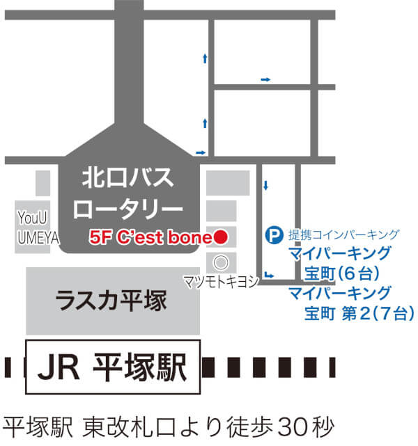 平塚駅東口改札を出て左(スタバ側)へ向かい、北口出口の階段を下り、右に向かい、ラスカの前の道をロータリーに沿うように真っ直ぐ進みます。正面に買取専門店「おたからや」の黄色い看板が出ているビルの5階が当店です。